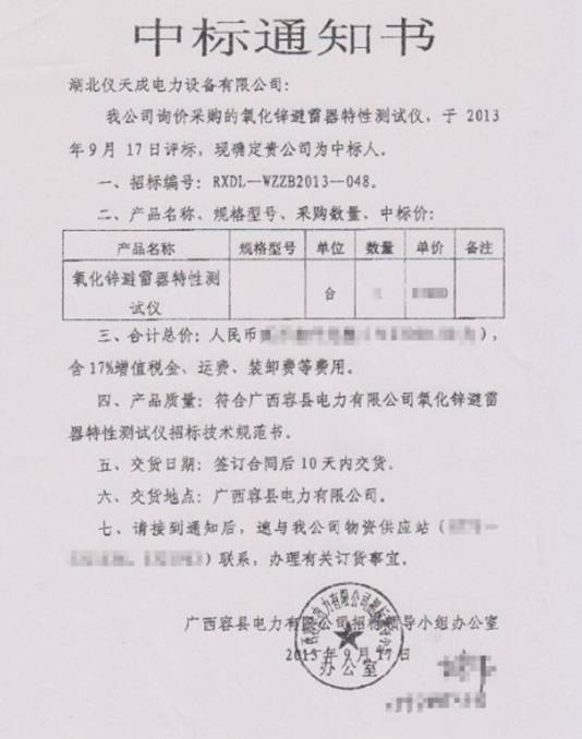 主題詞:廣西容縣電力 廣西水利電業(yè)集團 儀天成電力氧化鋅避雷器 中標(biāo)通知書