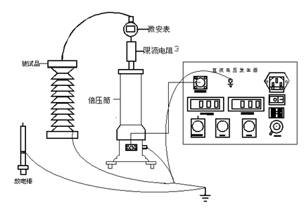 將機箱、倍壓筒放置到合適位置分別聯接好電源線、電纜線和接地線,保護接地線與工作接地線以及放電棒的接地線均應單獨接到試品的地線上(即一點接地),電源開關放在關斷位置并檢查調壓電位器應在零位。過電壓保護整定值一般為試驗電壓的1.1倍。順時針方向平緩調節調壓電位器,輸出端即從零開始升壓,升至所需電壓后,按規定時間記錄電流表讀數,并檢查控制箱及高壓輸出線有無異常現象及聲響。