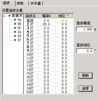 各相的諧波分量的數據可以選擇“以幅值的方式表示”,也可以選擇“以基波的百分比表示”。當選“以基波的百分比表示”,在“諧波” 頁面中各相諧波的值顯示為相對于基波幅值的百分比,變量的幅值步長也以基波的百分比表示。例如,在“以幅值表示”時,某相電壓2次諧波幅值為2V,基波幅值為10V,則當選擇“以基波的百分比表示”時,此時顯示的2次諧波為20%。