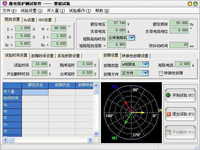 跳閘延時(shí):模擬斷路器的跳閘動(dòng)作時(shí)間,測試儀根據(jù)開入量的連接,一旦接受到保護(hù)的跳閘信號,經(jīng)過“跳閘延時(shí)”后,方進(jìn)入跳閘后的電壓電流狀態(tài)。