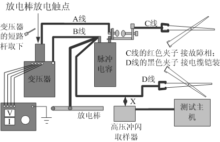 步驟6:用高壓沖閃線連接主機(jī)信號(hào)接口和高壓沖閃取樣器。高壓沖閃取樣器要盡量靠近上圖中的“D”連接線,這樣更容易接收故障信號(hào)。