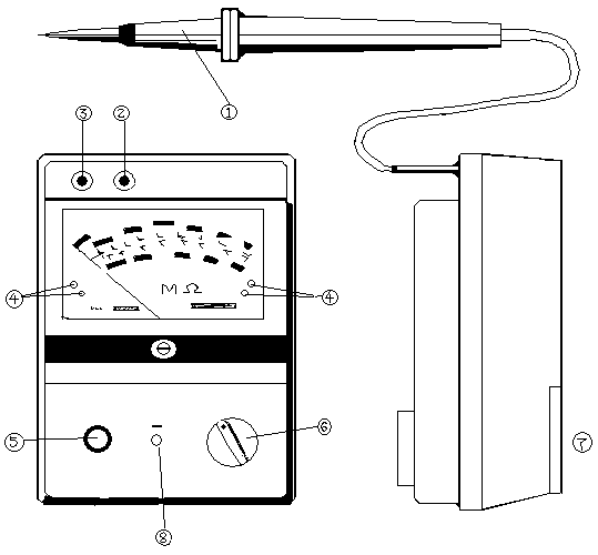 通常儀表的功能開關(guān)⑥置于OFF位,在進(jìn)行測(cè)量時(shí)將它置于MΩ或GΩ位,從儀表的地端③和②分別引出兩根測(cè)試線到被測(cè)物的地端和大地,再將儀表的探頭①接被測(cè)物測(cè)試點(diǎn)并按測(cè)試紐⑤(順時(shí)針方向旋轉(zhuǎn)后可自鎖)既可開始測(cè)量.
