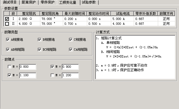 本模塊允許同時(shí)校驗(yàn)兩段定值,并且一次性模擬所有故障類型。試驗(yàn)時(shí),只需要勾選需要測(cè)試的項(xiàng)目,然后按定值單將各種定值參數(shù)依次進(jìn)行設(shè)置即可。M的值默認(rèn)情況下有0.9和1.1兩種設(shè)置,一般地,M=0.9時(shí),保護(hù)應(yīng)可靠不動(dòng)作,M=1.1時(shí),保護(hù)應(yīng)可靠動(dòng)作。設(shè)置M=1.2時(shí),可以測(cè)出保護(hù)的動(dòng)作時(shí)間。“短路電流”參數(shù)應(yīng)設(shè)置得大一些,建議10~20A,因?yàn)槎搪冯娏魈。鶕?jù)上述公式計(jì)算出來(lái)的電壓可能為負(fù)值。試驗(yàn)時(shí),“距離保護(hù)”壓板應(yīng)投入。