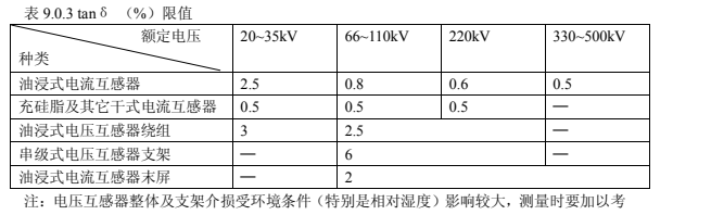 1.互感器的繞組 tanδ測量電壓應(yīng)在 10kV 測量,tanδ不應(yīng)大于表 9.0.3 中數(shù)據(jù)。當(dāng)對絕緣有懷疑時(shí),可采用高壓法進(jìn)行試驗(yàn),在(0.5~1) Um√3 范圍內(nèi)進(jìn)行,tanδ變化量不應(yīng)大于0.2% ,電容變化量不應(yīng)大于0.5%;