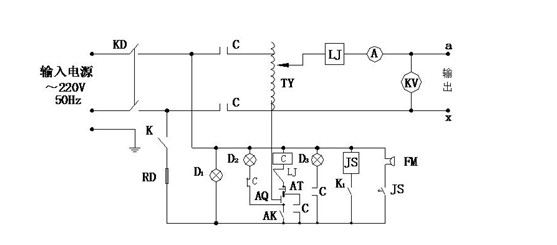 其中JS:時間繼電器 TY:自藕調(diào)壓器 FM:報警器 LJ:過流繼電器 D1、D2、D3:指示燈 C:交流接觸器 RD:熔斷器 K:總電源開關(guān) K1:時間繼電器電源開關(guān) AK:調(diào)壓器回零限位開關(guān) AQ:起動按鈕 CL:高壓硅堆 AT:停止按鈕 A:輸出電流表 KV:輸出電壓表