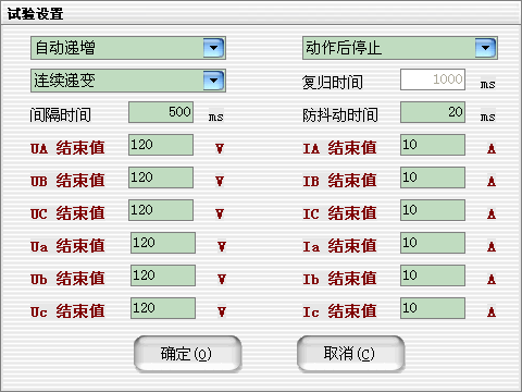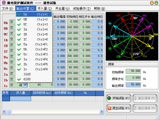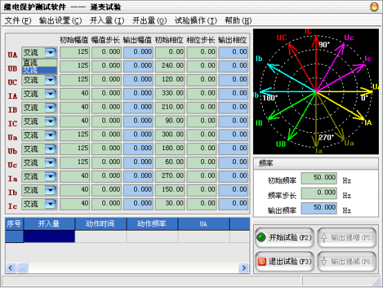 當(dāng)需要使用的輸出相被選擇后,可以設(shè)定微機繼電保護測試儀各輸出相的起始參數(shù),比如幅值、相位,接著可以設(shè)定幅值的變化步長和相位的變化步長。一旦通道的輸出達(dá)到大值或小值后,如果試驗還沒有停止,通道繼續(xù)保持輸出,不再遞增或遞減。