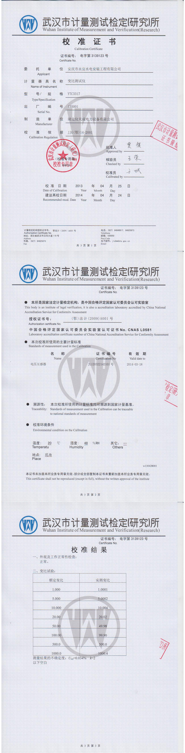 轉載:"YTC3317全自動變比組別測試儀資質證書" 請注明來源于儀天成電力。 更多技術問題請致電儀天成電力客戶服務:027-87876585,技術部專線:027-87876585,在線客服:719388481