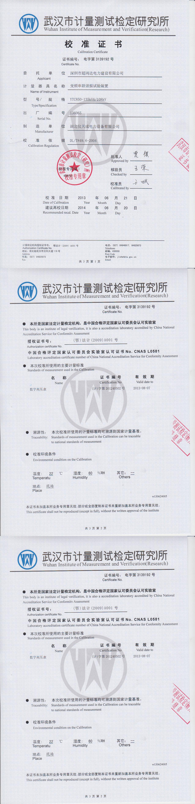 轉載:"YTC850系列變頻串聯(lián)諧振試驗裝置資質證書" 請注明來源于儀天成電力。 更多技術問題請致電儀天成電力客戶服務:027-87876585,技術部專線:027-87876585,在線客服:719388481