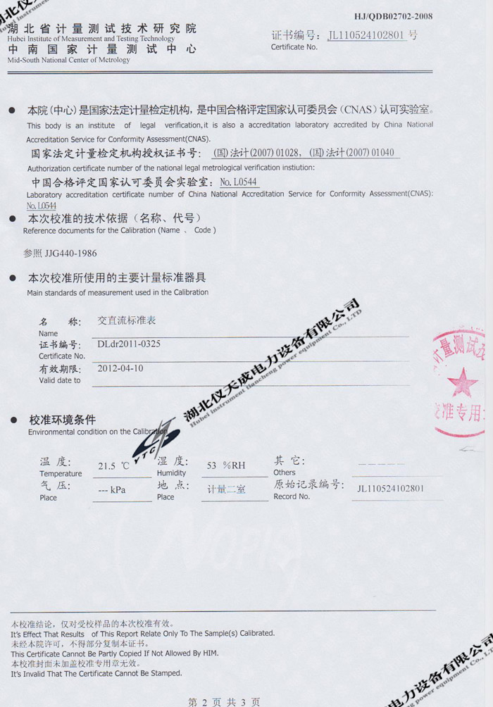 YTC2220數字雙鉗相位伏安表的資質證書