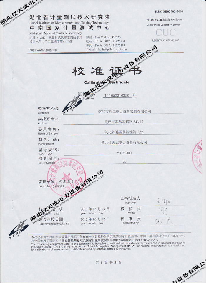 轉(zhuǎn)載:"YTC620D氧化鋅避雷器特性測(cè)試儀的資質(zhì)證書(shū)" 請(qǐng)注明來(lái)源于儀天成電力。 更多技術(shù)問(wèn)題請(qǐng)致電儀天成電力客戶服務(wù):027-87876585,技術(shù)部專線:027-87876585,在線客服:719388481