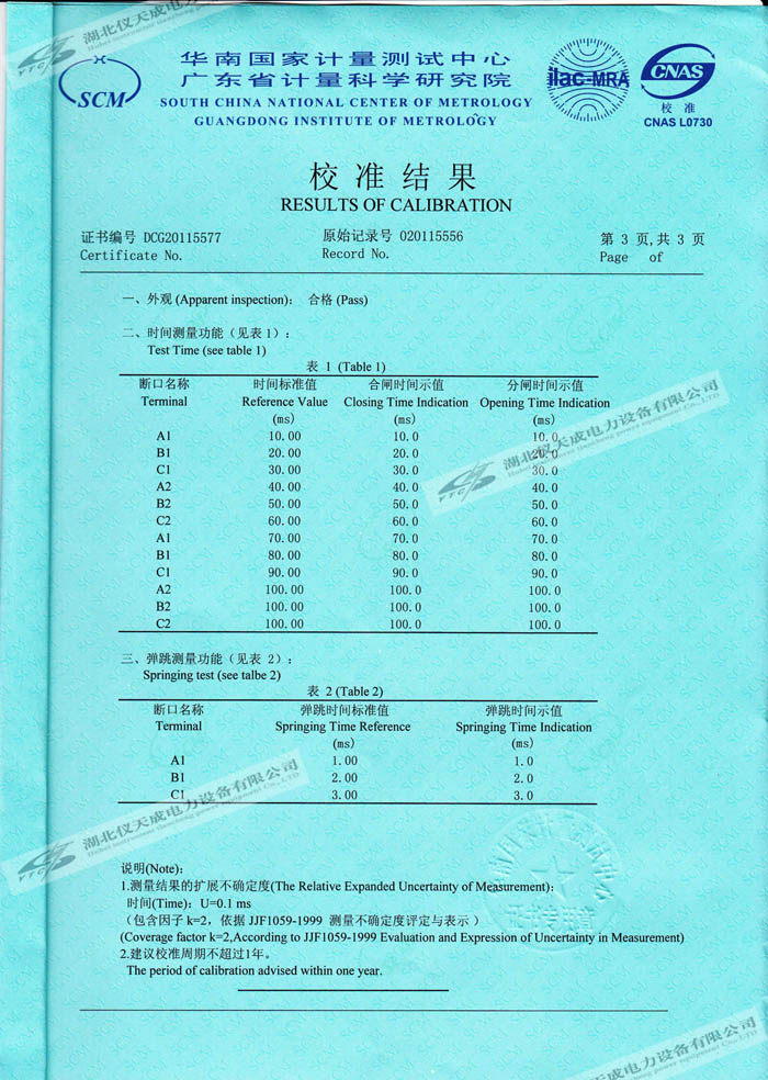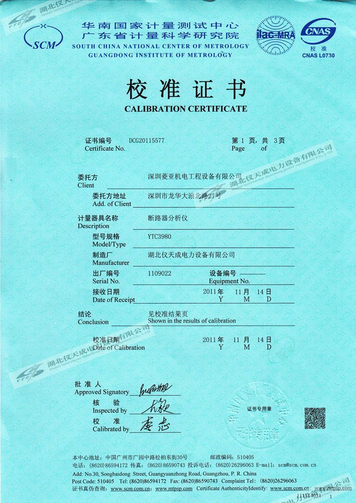 轉(zhuǎn)載:"YTC3980斷路器分析儀的資質(zhì)證書(shū)" 請(qǐng)注明來(lái)源于儀天成電力。 更多技術(shù)問(wèn)題請(qǐng)致電儀天成電力客戶(hù)服務(wù):027-87876585,技術(shù)部專(zhuān)線(xiàn):027-87876585,在線(xiàn)客服:719388481
