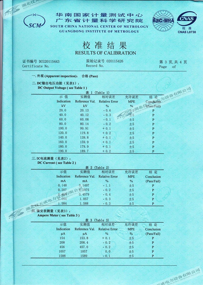 YTCZG-200kV2mA直流高壓發生器的資質證書