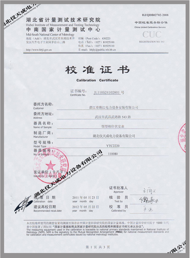 YTC2220數字雙鉗相位伏安表鑒定證書