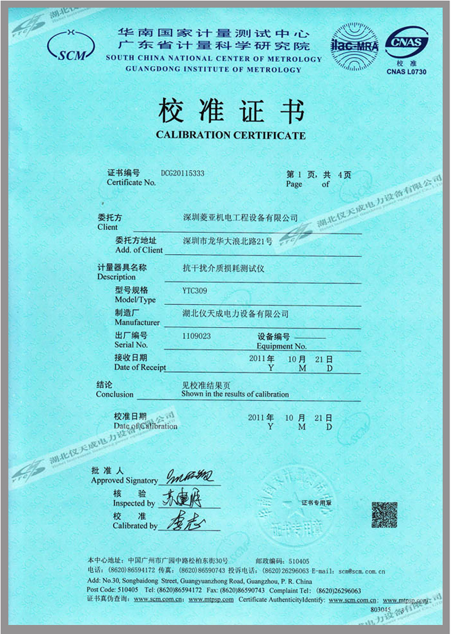 轉載:"YTC309抗干擾介損自動測試儀鑒定證書" 請注明來源于儀天成電力。 更多技術問題請致電儀天成電力客戶服務:027-87876585,技術部專線:027-87876585,在線客服:719388481